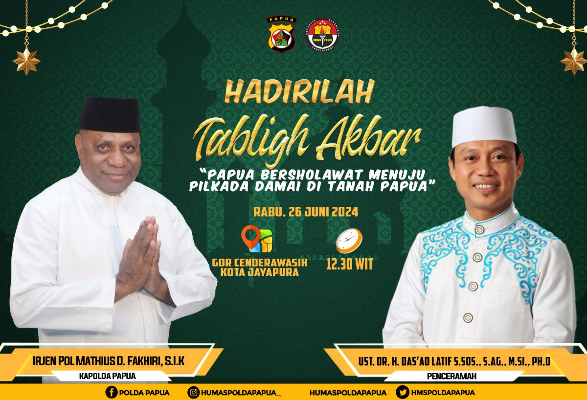 Papua – Kapolda Papua, Irjen Pol Mathius D. Fakhiri, S.I.K bersama Kapolresta Jayapura Kota, Kombes Pol. Dr. Victor D. Mackbon, S.H., S.I.K., M.H., M.Si menggelar Giat Tabligh Akbar dalam rangka Papua Bershalawat Menuju Pemilukada Damai di Tanah Papua. Acara ini akan diselenggarakan di GOR Cenderawasih Jayapura pada Rabu, 26 Juni mendatang.