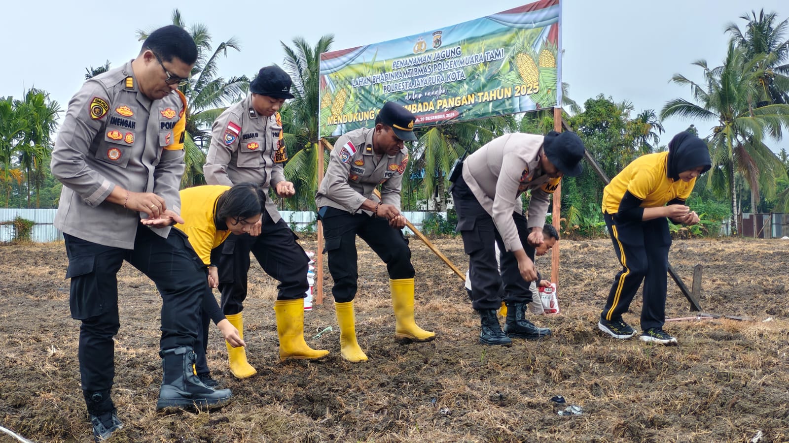 Papua – Polresta Jayapura Kota terus berkomitmen nyata dalam menyukseskan program Ketahanan Pangan Nasional. Komitmen ini diwujudkan melalui aksi penanaman bibit jagung secara simbolis di lahan binaan Bhabinkamtibmas Polsek Muara Tami yang berlokasi di Jl. Trans Abepura-Arso, Distrik Muara Tami, Sabtu (20/12/2025).