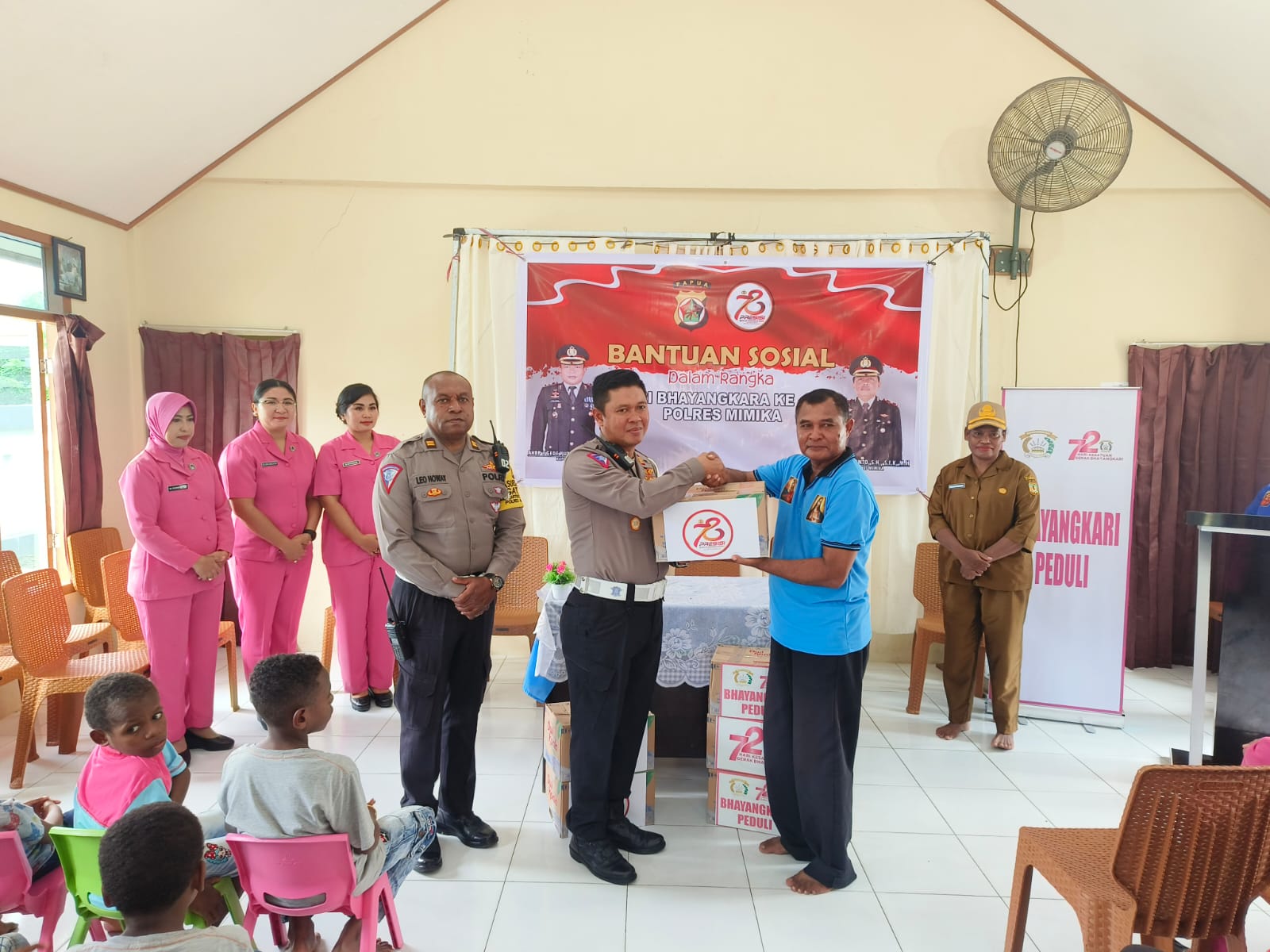Papua – Jelang Hari Bhayangkara ke 78, Polres Mimika melalui Satlantas dan Bhyangkari melakukan kunjungan kasih dan memberikan bantuan sosial kepada anak-anak asuh yang ada di Panti Asuhan Santa Susana Sp 5. Kegiatan ini dilakukan di Panti Asuhan Santa Susana Sp 5, Gang Petra Kampung Ninabua Distrik Mimika Baru, (24/6/2024)