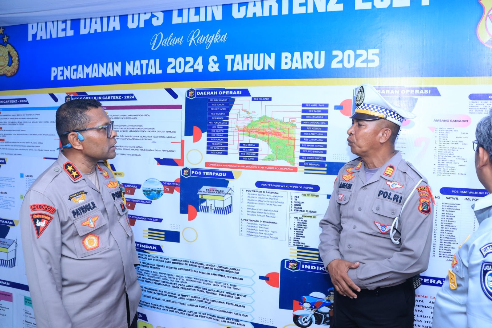 Papua – Kapolda Papua, Irjen Pol Patrige R. Renwarin, S.H., M.Si dan Wakapolda Papua, Brigjen Pol Dr. Faizal Ramadhani, S.Sos.,S.I.K.,M.H. bersama dengan Pejabat Utama Polda Papua, melakukan pengecekan pos pengamanan dan pelayanan Operasi Lilin Cartenz 2024, pada Selasa (31/12/2024).