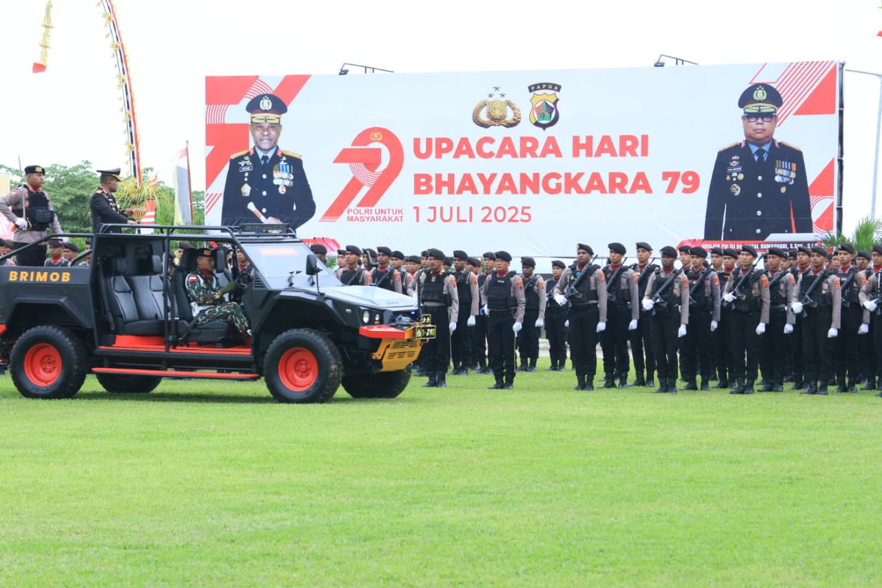 Papua – Kepala Kepolisian Daerah (Kapolda) Papua, Irjen Pol. Patrige R. Renwarin, S.H., M.Si., memimpin Upacara Parade dalam rangka peringatan Hari Bhayangkara ke-79. Upacara berlangsung khidmat di Lapangan apel Mako Polda Papua Koya Koso Distrik Muara Tami Kota Jayapura, Selasa (01/06/2025).