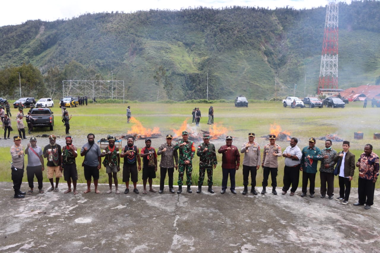 ” Puncak Jaya dijamin aman seperti yang disampaikan oleh Bapak Kapolda tadi, harapan saya dengan kegiatan pemusnahan alat-alat perang ini merupakan wujud nyata dari kedua belah pihak akan berdamai hari ini dan seterusnya akan berdamai dengan cara adat yang berlaku di adat Suku Dani ” harap Danrem 173/PVB.