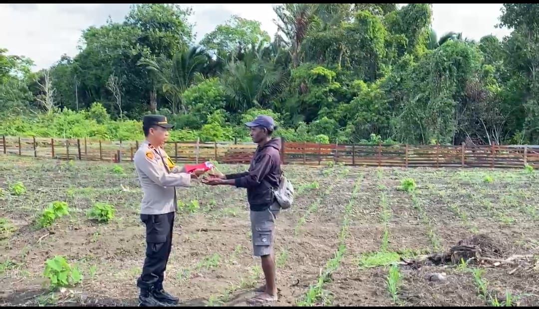 Kapolsek dan anggota menyempatkan diri untuk mendatangi warga yang tengah berkebun, memberikan bendera Merah Putih, dan mengajak mereka memasangnya di rumah masing-masing.