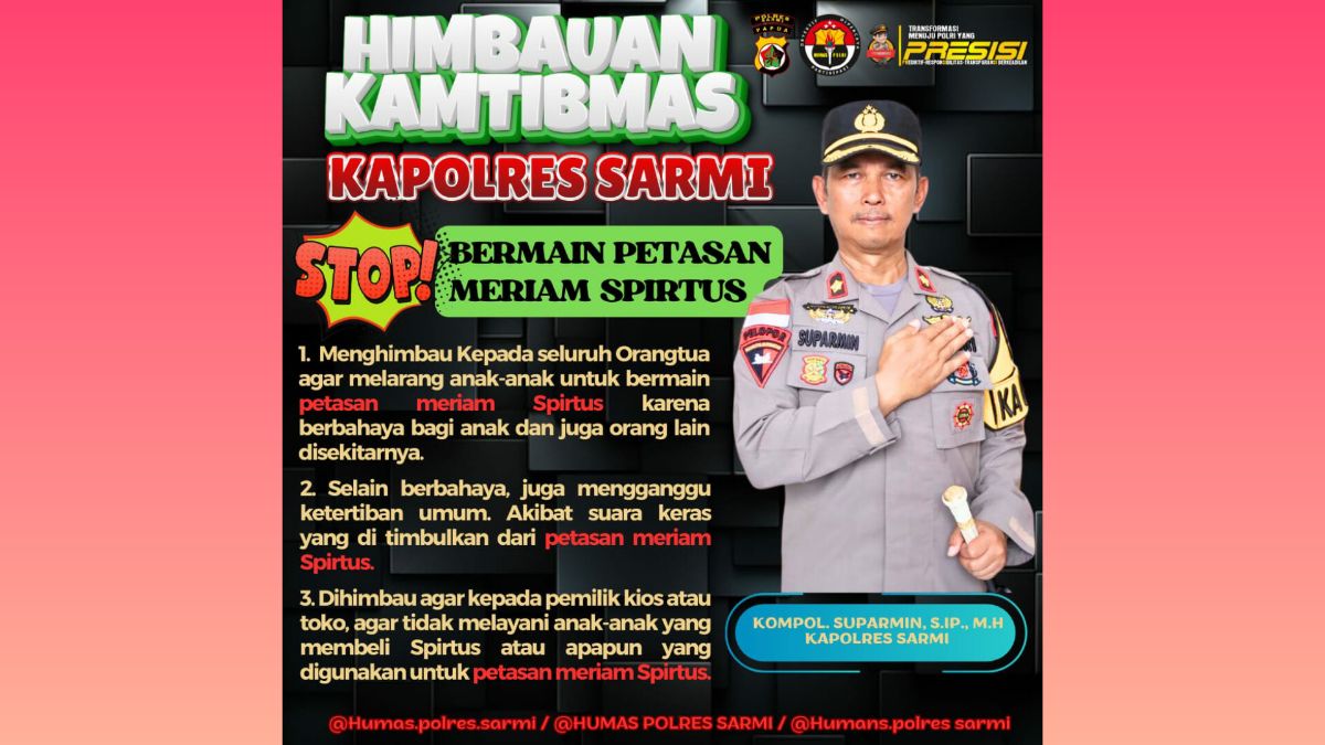 Himbauan disampaikan langsung Kapolres Sarmi Kompol Suparmin, S.I.P., M.H., untuk kepada orang tua di wilayah hukum Polres Sarmi agar melarang anak-anaknya untuk bermain meriam kaleng spirtus.
