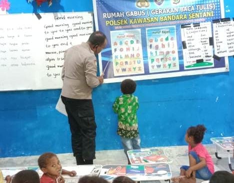 Papua – Unit Binmas Polsek Kawasan Bandara Sentani melanjutkan komitmennya dalam meningkatkan kemampuan baca tulis di kalangan anak-anak melalui program Gerakan Baca Tulis (GABUS). Kegiatan ini dilaksanakan pada Senin (24/6), di kediaman Ibu Agustina Felle, seorang guru di SD Negeri Komba, Jln. Durian Komba, Kompleks Pegunungan Bintang.