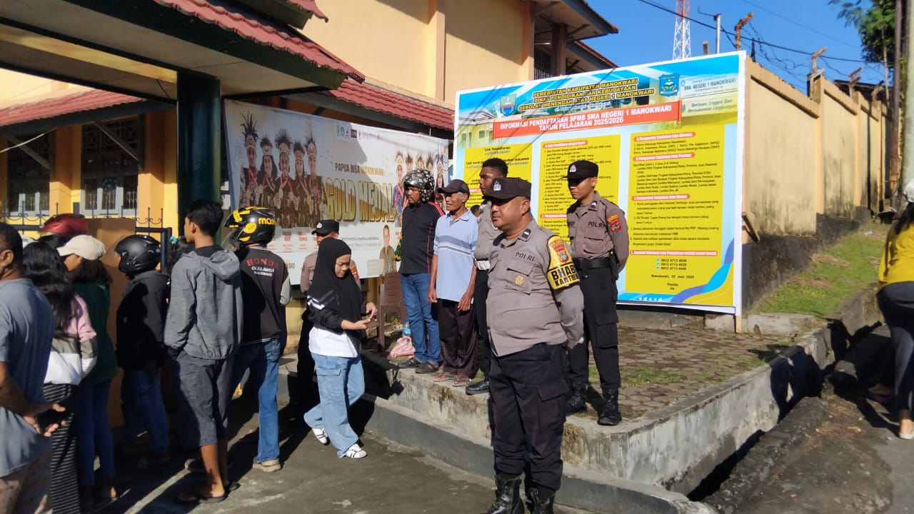 Papua Barat – Pengamanan penerimaan siswa baru SMA, SMP dan SD dilakukan dengan ketat oleh Polresta Manokwari, kegiatan ini berlangsung di SMA N 1, SMA N 2 SMP N 1, SMP N 2, SMP N 6 dan SD N 1 Manokwari.