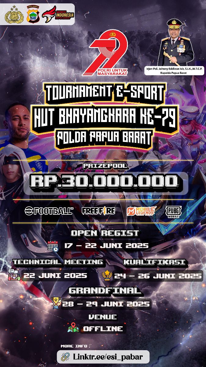 “Jangan lewatkan kesempatan ini! Segera daftarkan tim atau diri Anda, siapkan strategi terbaik, dan jadilah juara di Tournament E-Sport Hari Bhayangkara ke-79 Polda Papua Barat. Mari bersama-sama kita semarakkan perayaan Hari Bhayangkara dengan semangat sportifitas dan kebersamaan,” tutup Kombes Pol Ignatius Benny Ady Prabowo.