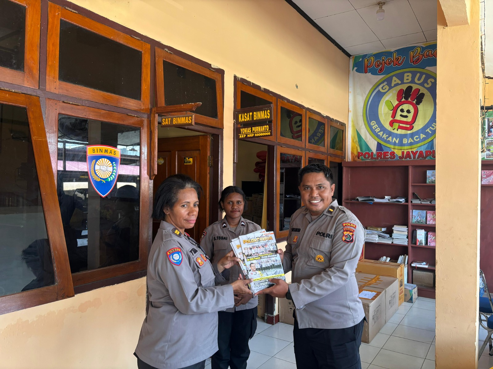 Pemberian majalah ini diberikan langsung oleh Personel Subbid Penmas kepada Sat Binmas Polres Jayapura yang diterima langsung oleh Kaur Bin Ops, Iptu Yuliani Tecuari.