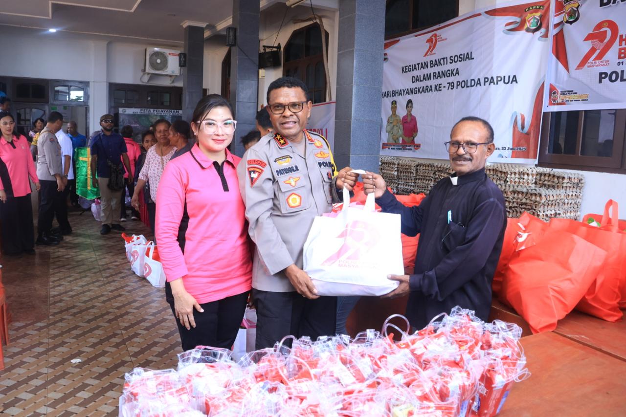 Papua – Dalam rangka memperingati Hari Bhayangkara ke-79 tahun 2025, Polda Papua menggelar kegiatan bakti sosial yang dilaksanakan di dua lokasi berbeda, yakni di Dermaga Ciberi, Kampung Tobati, Distrik Abepura, dan di GKI Immanuel APO Tugu, Distrik Jayapura Utara, Kota Jayapura, pada Selasa (24/06/2025).