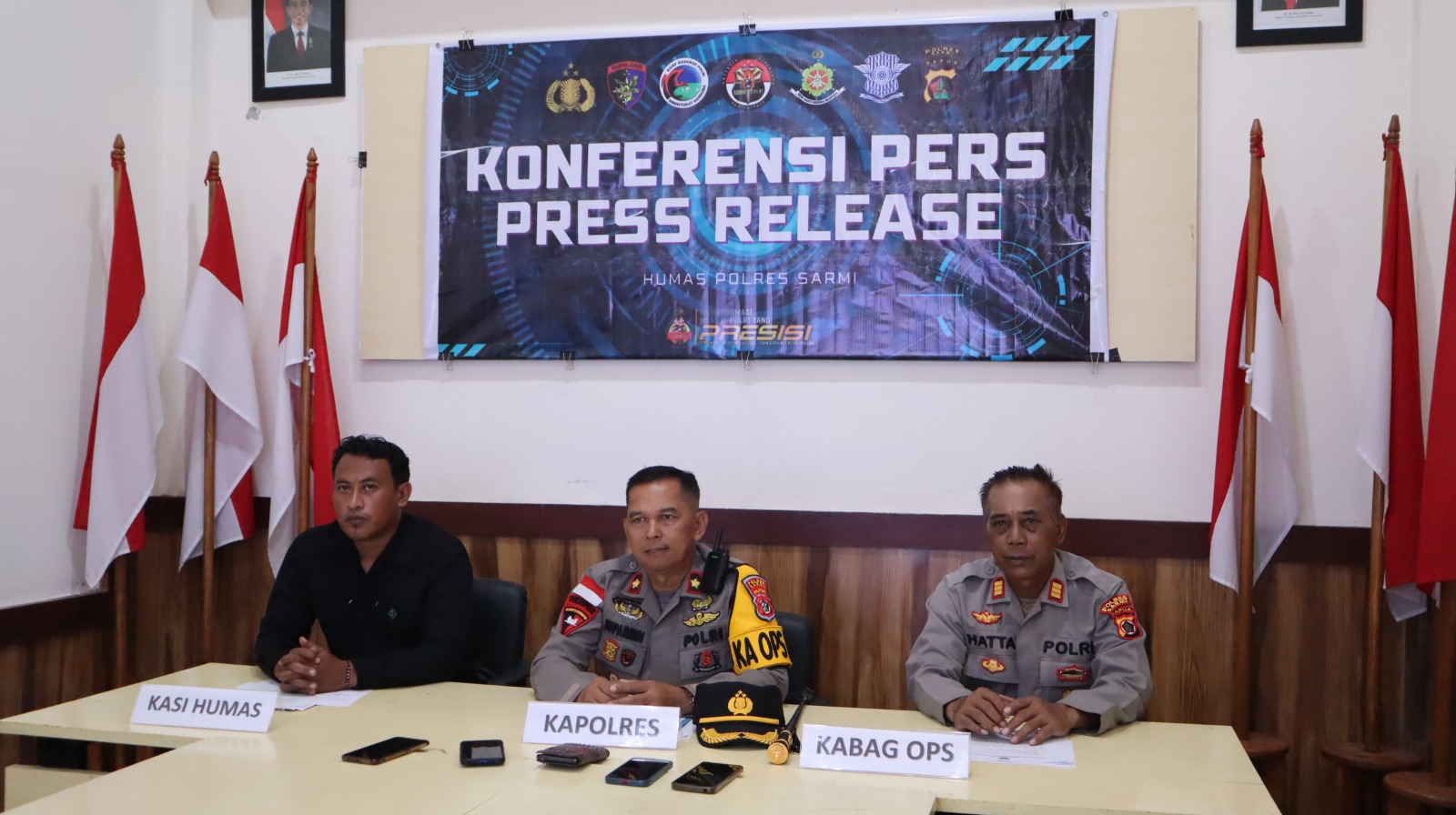 Sarmi – Kapolres Sarmi Kompol Suparmin, S.IP.,M.H yang didampingi Kasubdalops Polres Sarmi Akp. Hatta dan Kasubsi Penmas Sie Humas Polres Sarmi Bripka Rudhianto menggelar Pres Realese terkait penanganan Banjir yang terjadi di kabupaten Sarmi yang dilaksanakan di Aula Vicon Polres Sarmi. Senin (22/7/2024) malam.