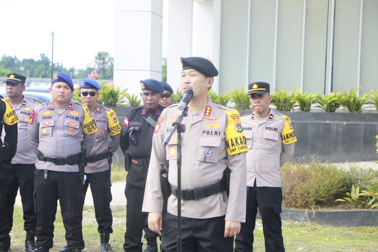 Pengamanan diawali dengan apel pengecekan personel yang dipimpin Wakaopsda Operasi Mantap Praja Cartenz 2024, Kombes Pol. Dede Alamsyah, S.I.K. Dalam arahannya, ia menegaskan pentingnya profesionalisme dan netralitas Polri dalam mengawal proses demokrasi.