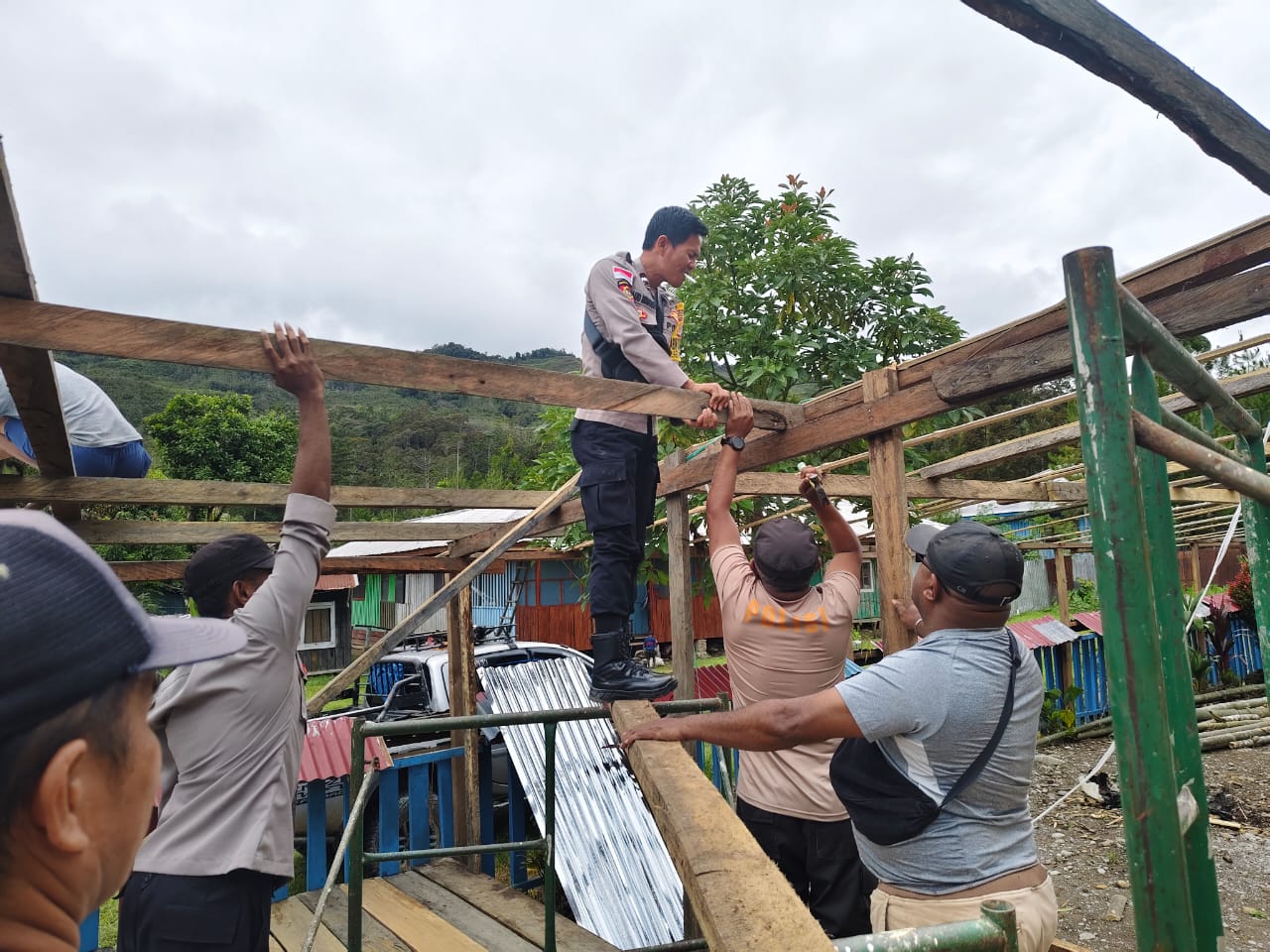 Papua – Menjelang peresmian Gedung Gereja GKI Solafide, personel Polsek Bokondini bersama warga dan jemaat gereja melaksanakan kegiatan gotong royong membangun panggung acara pada Selasa (25/11/2025).