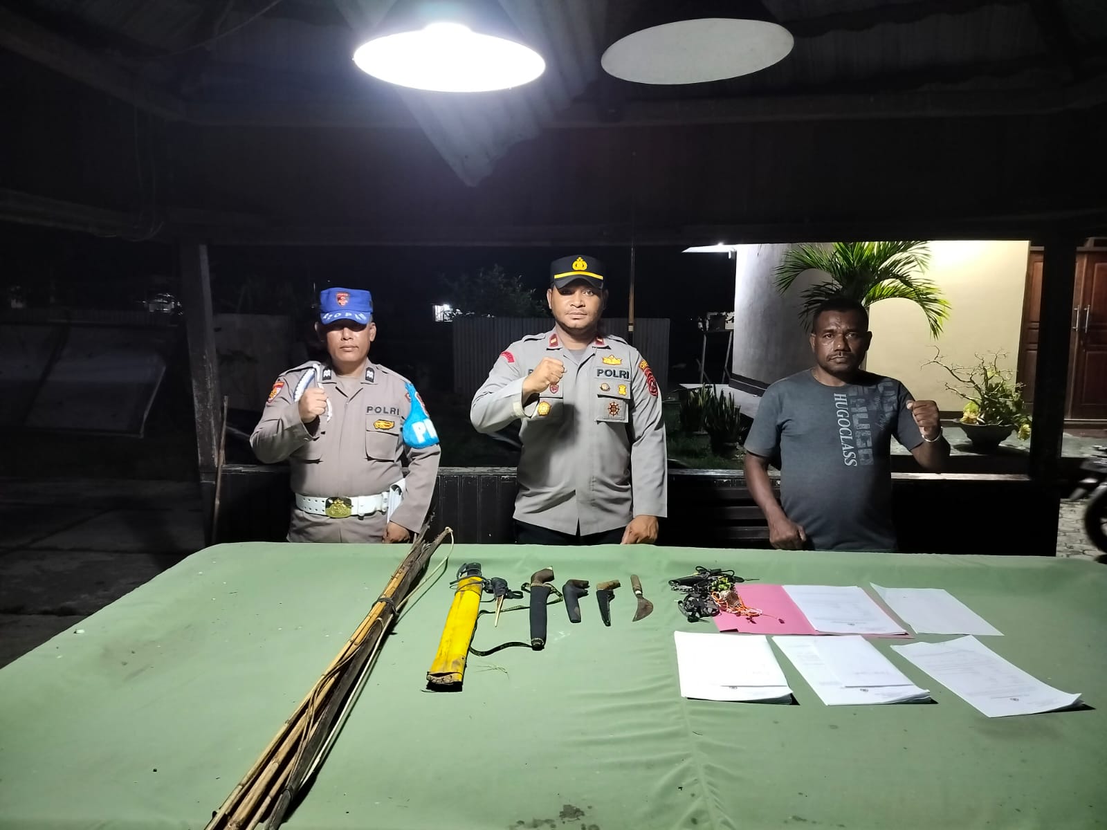 “Di antaranya adalah 2 buah parang, 1 buah tulang kaswari, 3 buah badik, 1 buah kalawai, 4 buah anak panah, dan 2 buah busur,” ujarnya.