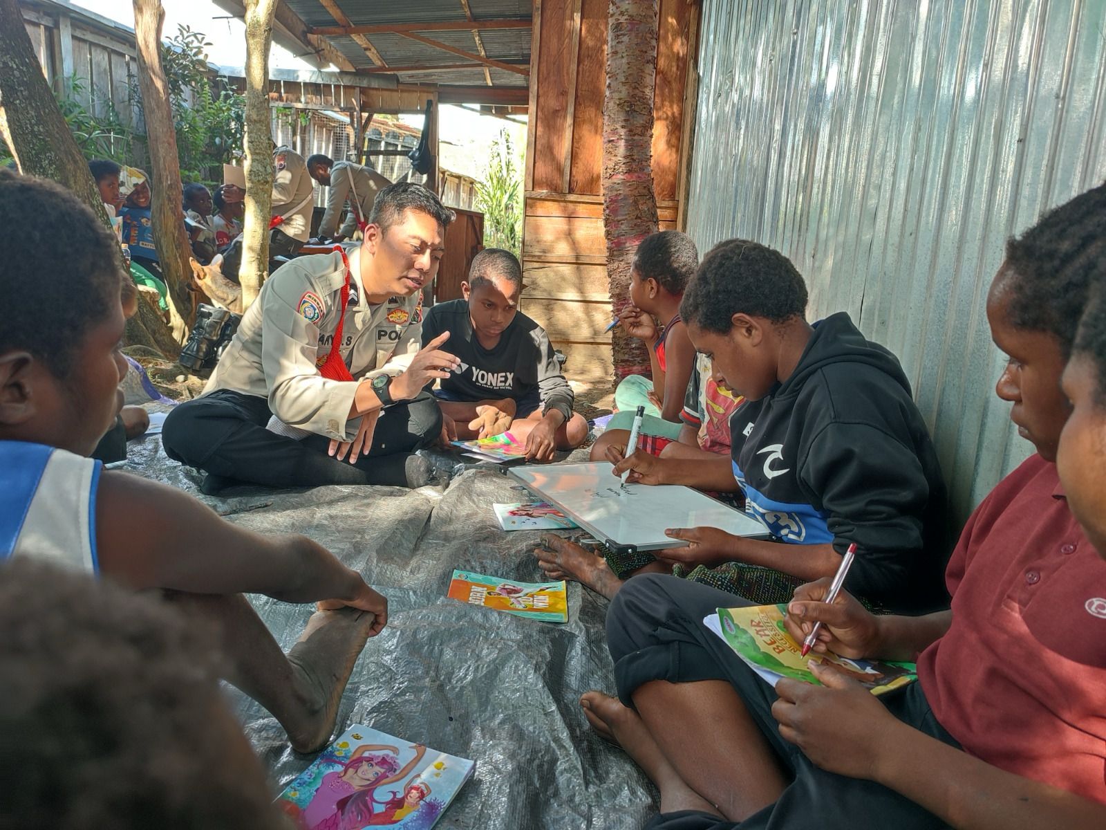 Dipimpin langsung oleh Kasubsatgas Si-IPAR, IPTU Benyamin Tandipayung, kegiatan ini menghadirkan suasana belajar yang penuh keakraban. Di bawah naungan pohon dan berlantaikan tikar sederhana, anak-anak tampak antusias mengikuti sesi pembelajaran bersama anggota kepolisian. Materi yang disampaikan tidak hanya seputar baca tulis, tetapi juga nilai-nilai kebangsaan, kedisiplinan, dan hidup saling menghargai.