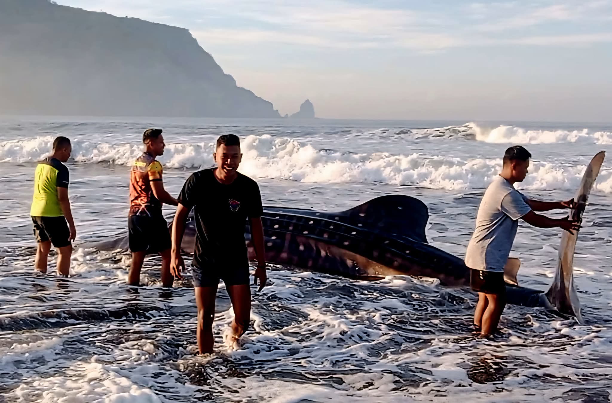 Satgasmar Pulau Nusa Barung Selamatkan Hiu Paus yang Terdampar di Pantai Pancer