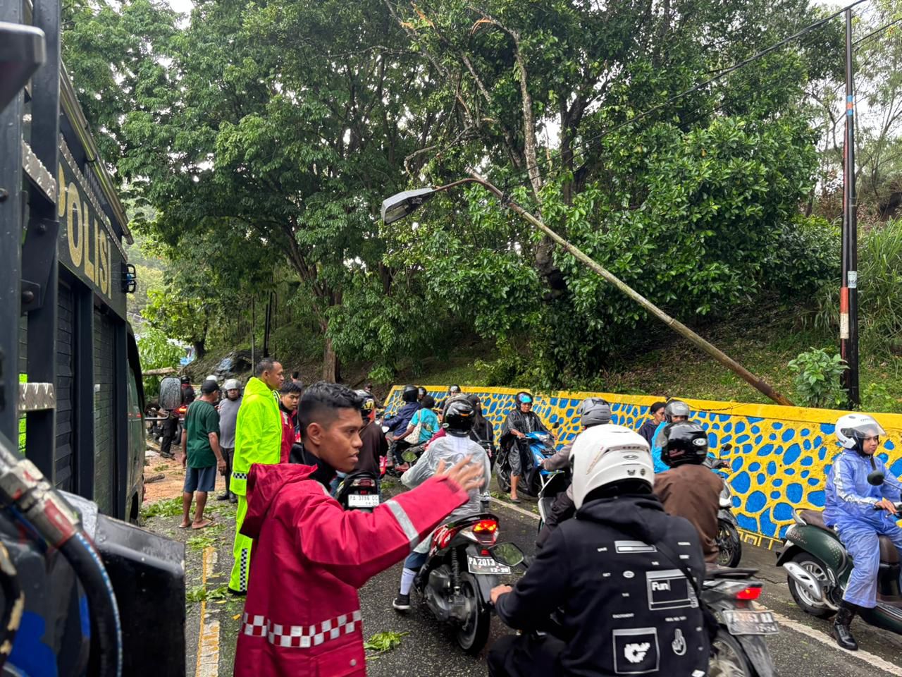 Papua – Personel Tim SAR Regu 1 Gasum Direktorat Samapta Polda Papua bergerak cepat mengevakuasi pohon tumbang yang menghalangi akses jalan utama di tanjakan Pospol Lantas Vihara Skeylen, Senin (27/10/2025) sore.